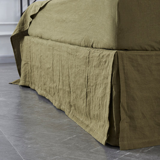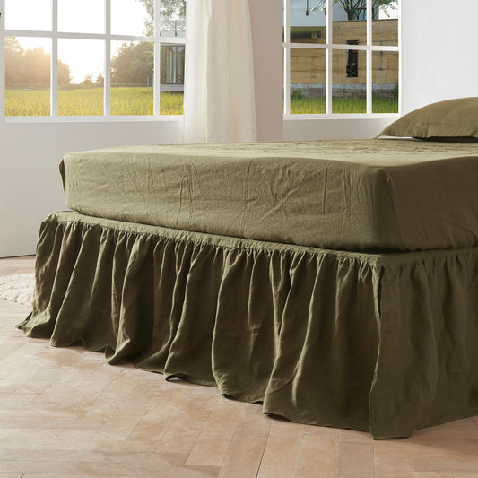 Green Olive Gathered Ruffle Linen Bedskirt