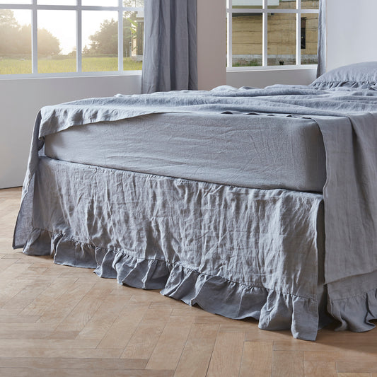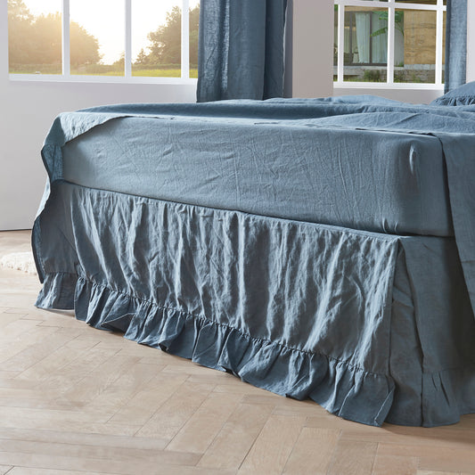 French Blue 100% Linen Ruffle Hem Bedskirt