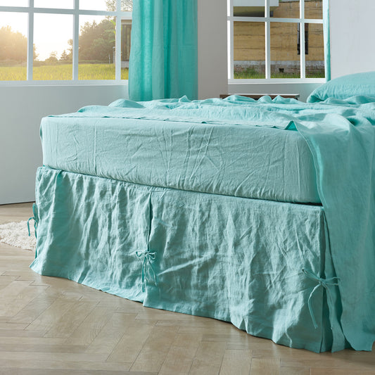 Aqua Green 100% Linen Side Pleated Bedskirt With Knots