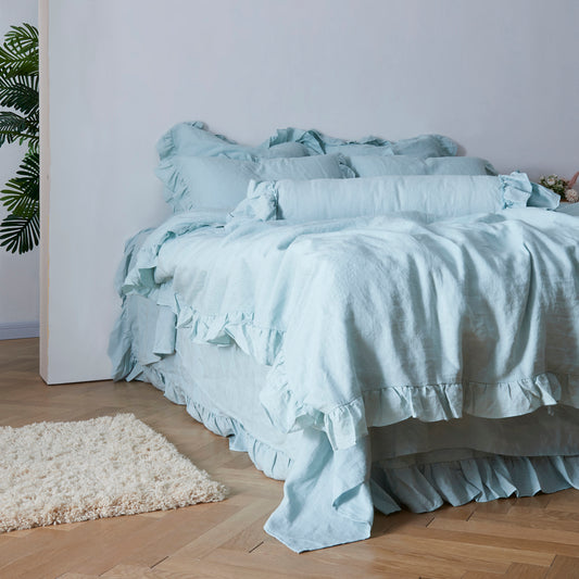Serenity and peace have new meanings with this ruffled linen duvet cover in pale blue. With a soft, gentle blue color reminiscent of a beautiful summer sky, you can easily bring nature and color into your home. The ruffles add whimsy and sophistication to your bedding, and the ever-softening linen creates a perfect oasis for peaceful sleeping. A sweet, dainty option, this pale blue linen duvet cover will please anyone.