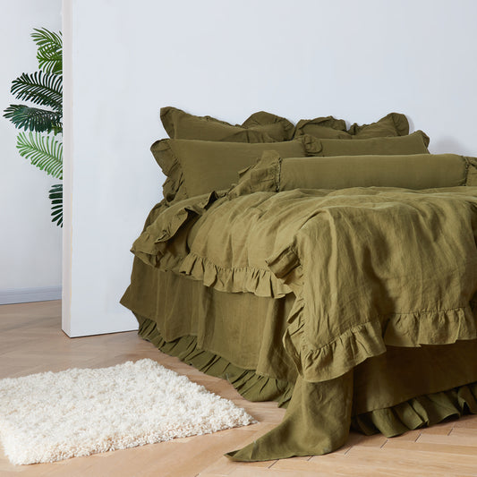 Invite rich, earthy tones into your home with a Green Olive Ruffled Linen Duvet Cover. The gentle, pretty ruffles with the bold green olive color create the perfect paradox to add interest and texture to your room. Not only is this ruffled linen bedding beautiful, but it’s extremely functional and will only get better with time. Linen boasts all sorts of great qualities to improve your sleep, so your new ruffled linen duvet cover will have you resting like royalty.