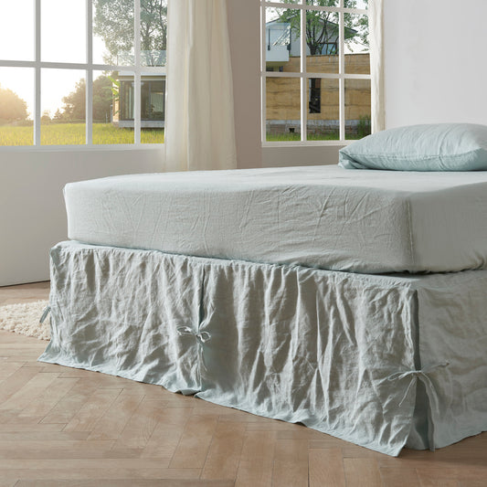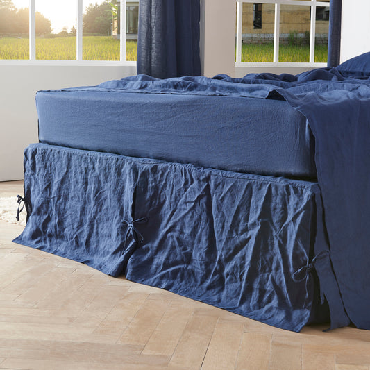 - French Blue 100% Linen Side Pleated Bedskirt with Knots